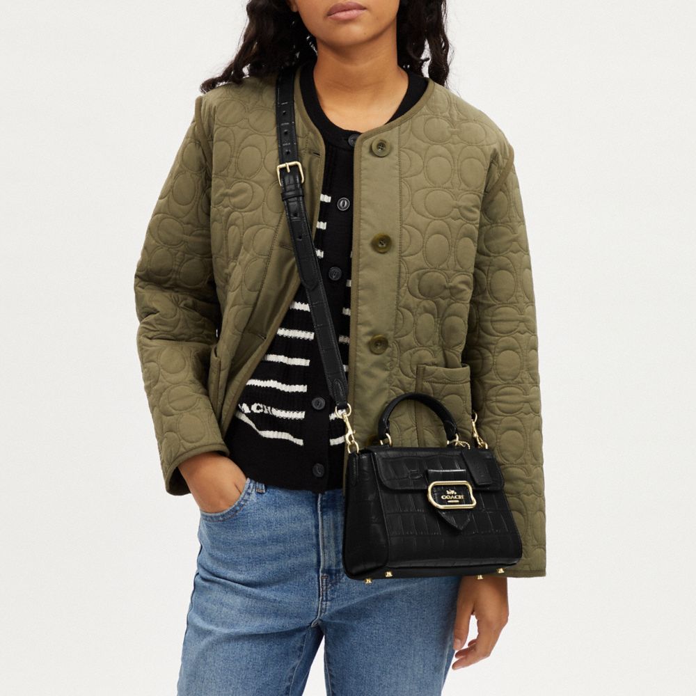 | Crocodile-embossed leather and smooth leather | Inside zip and multifunction pockets | Snap closure, fabric lining | Top handle with 2 3/4" drop | Outside open pocket | Detachable strap with 22" drop for shoulder or crossbody wear | Four protective feet at base | 8 1/4" (L) x 6 1/4" (H) x 4 1/4" (W)|Style No. CN747|