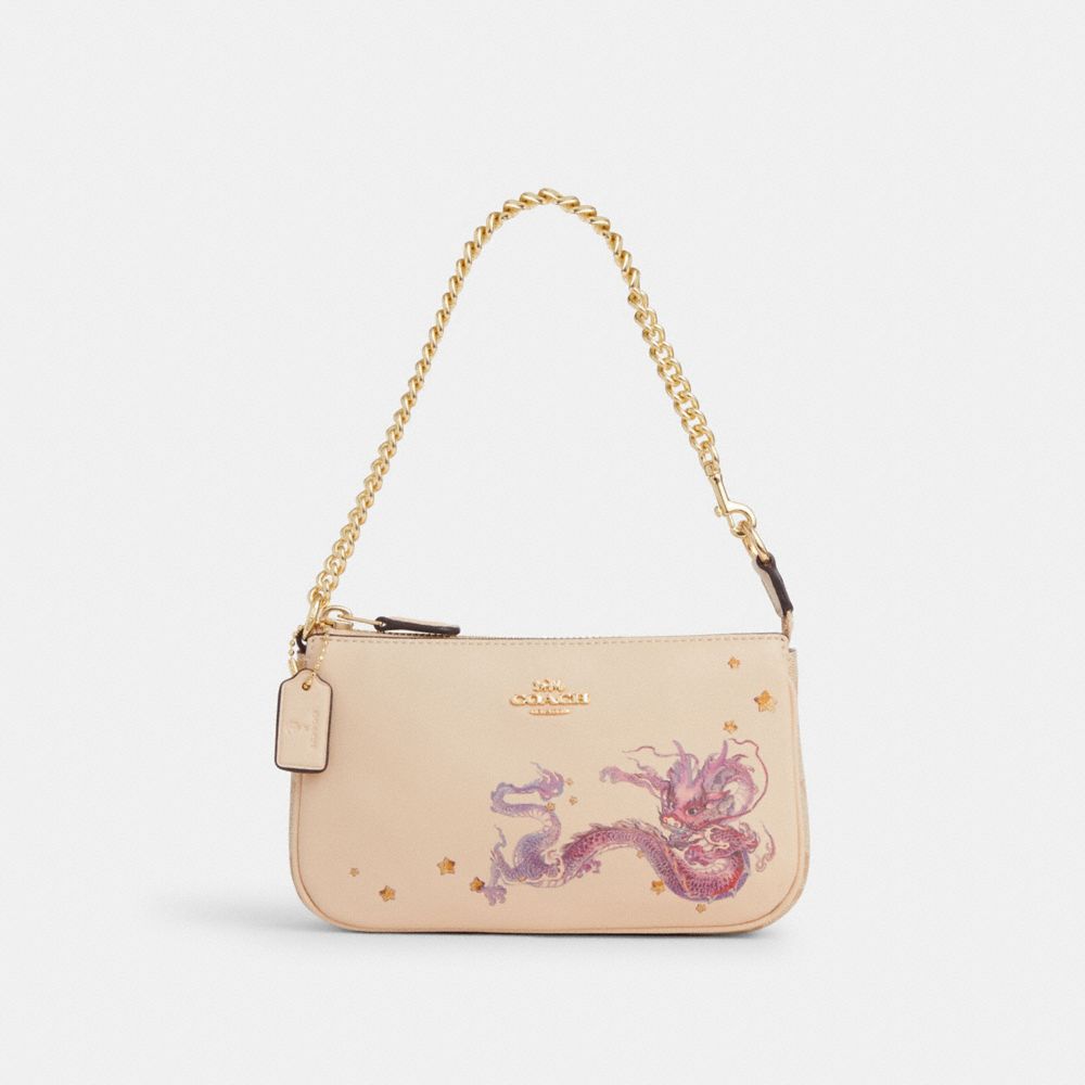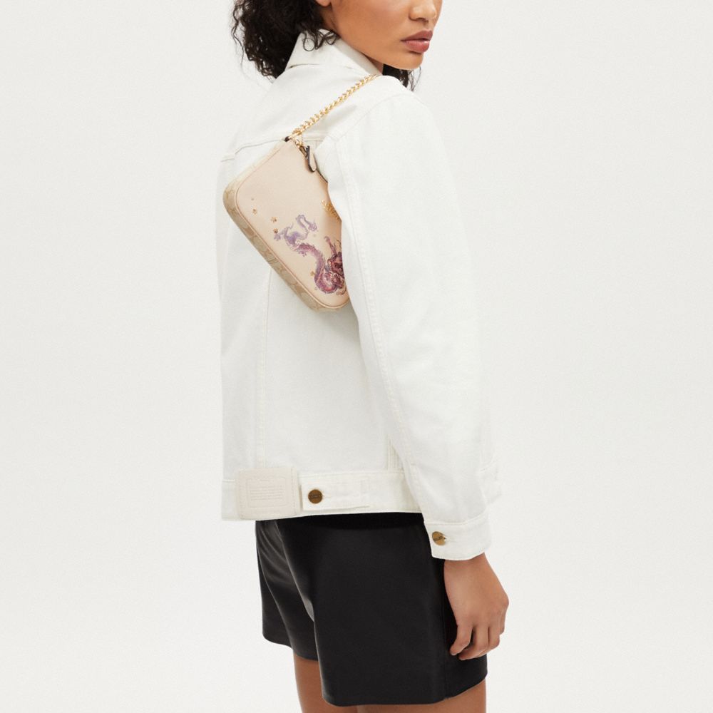 | Smooth leather and Signature coated canvas | Two credit card slots | Inside multifunction pocket | Zip-top closure, fabric lining | Chain handle with 6 1/4" drop | 7 1/2" (L) x 4 1/2" (H) x 2" (W) | About the Creative: Celebrate 2024 Year of the Dragon with our dreamy dragon motif designed in collaboration with Beijing-based artist Lian Yang. A young artist dedicated to the research, innovation and rediscovery of traditional Chinese art forms, she combines ancient and contemporary techniques to create breathtakingly beautiful (and original!) works of art.|Style No. CQ072|