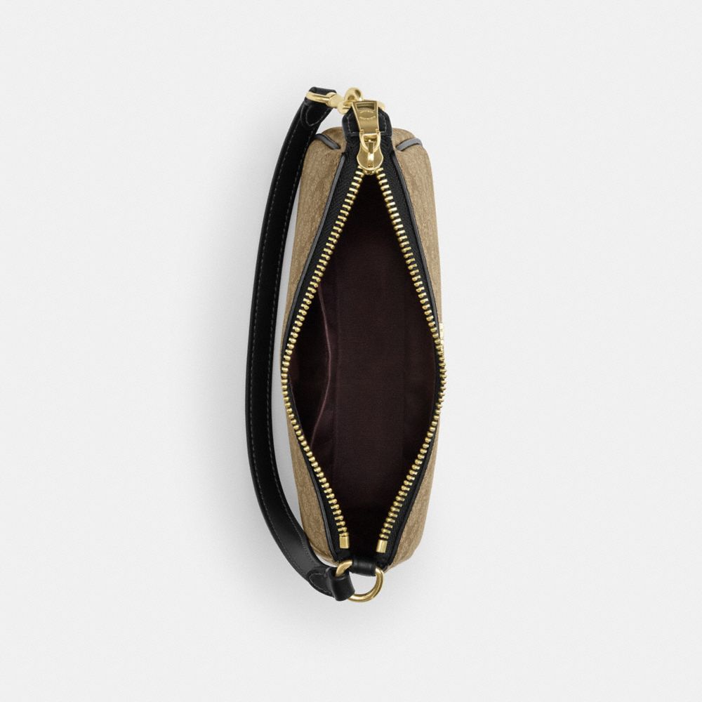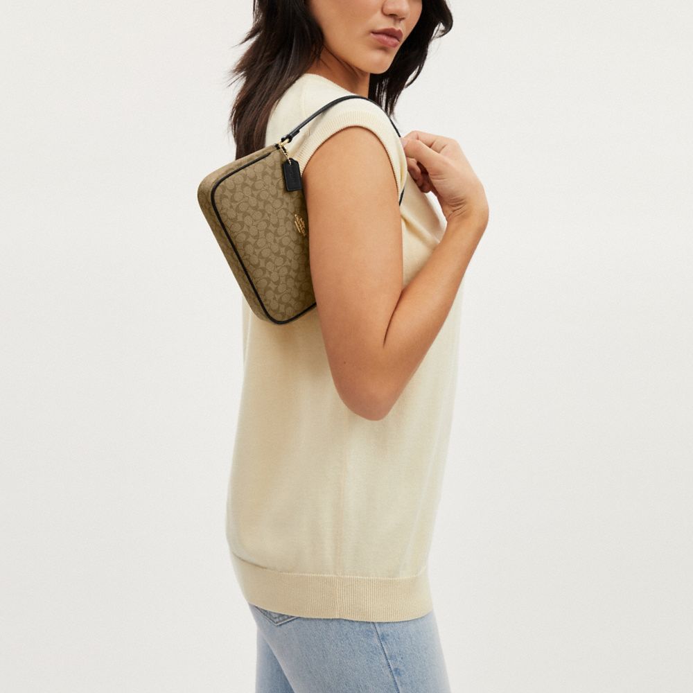 | Signature coated canvas and recycled leather | Two credit card slots | Inside multifunction pocket | Zip-top closure, fabric lining | Handle with 6 1/4" drop | 7 1/2" (L) x 4 1/2" (H) x 2" (W)|Style No. CS445|