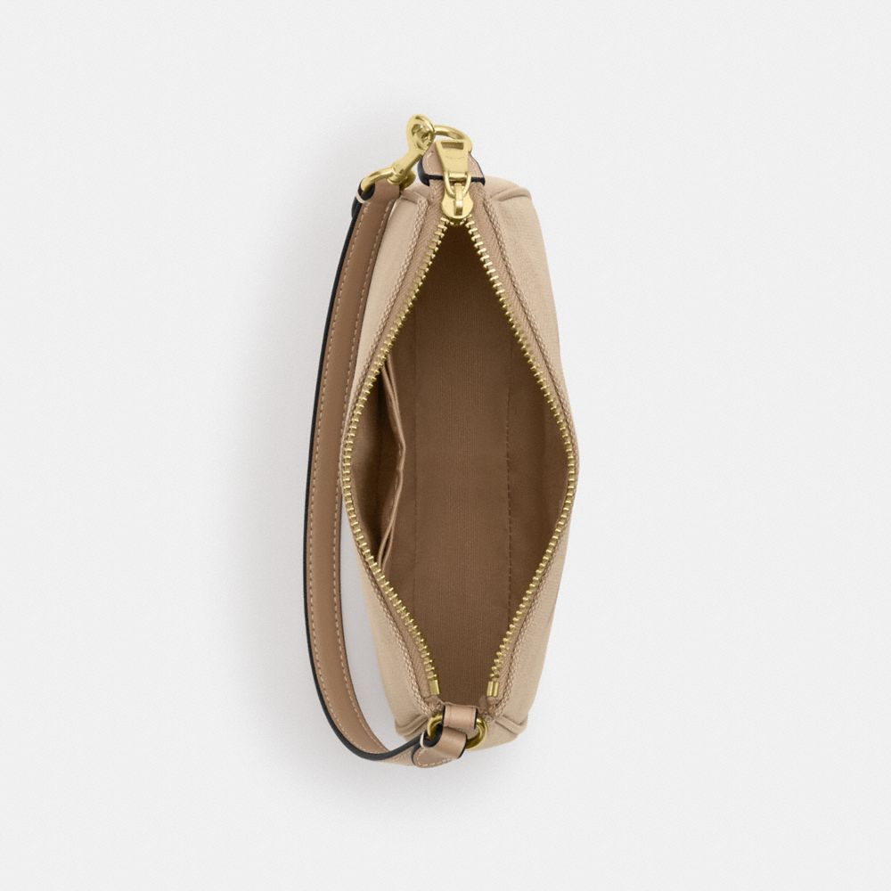 | Canvas and smooth leather | Two credit card slots | Zip-top closure, fabric lining | Handle with 6 1/4" drop | 7 1/2" (L) x 4 1/2" (H) x 2" (W) | Exclusive of trim, this piece is crafted of material made from regenerative cotton and recycled polyester|Style No. CAQ18|