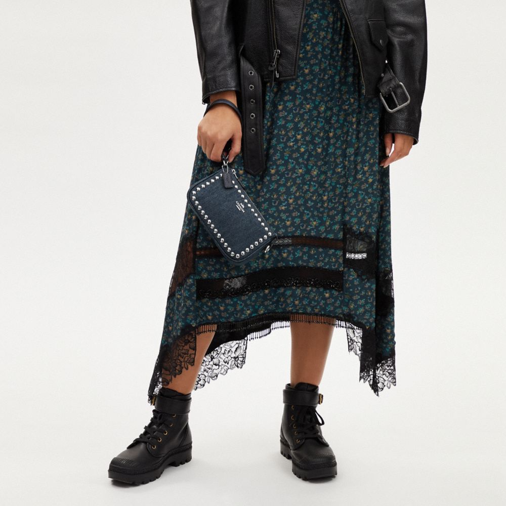 | Denim and refined pebble leather | Two credit card slots | Inside multifunction pocket | Zip-top closure, fabric lining | Handle with 6 1/4" drop | 7 1/2" (L) x 4 1/2" (H) x 2" (W)|Style No. CM251|