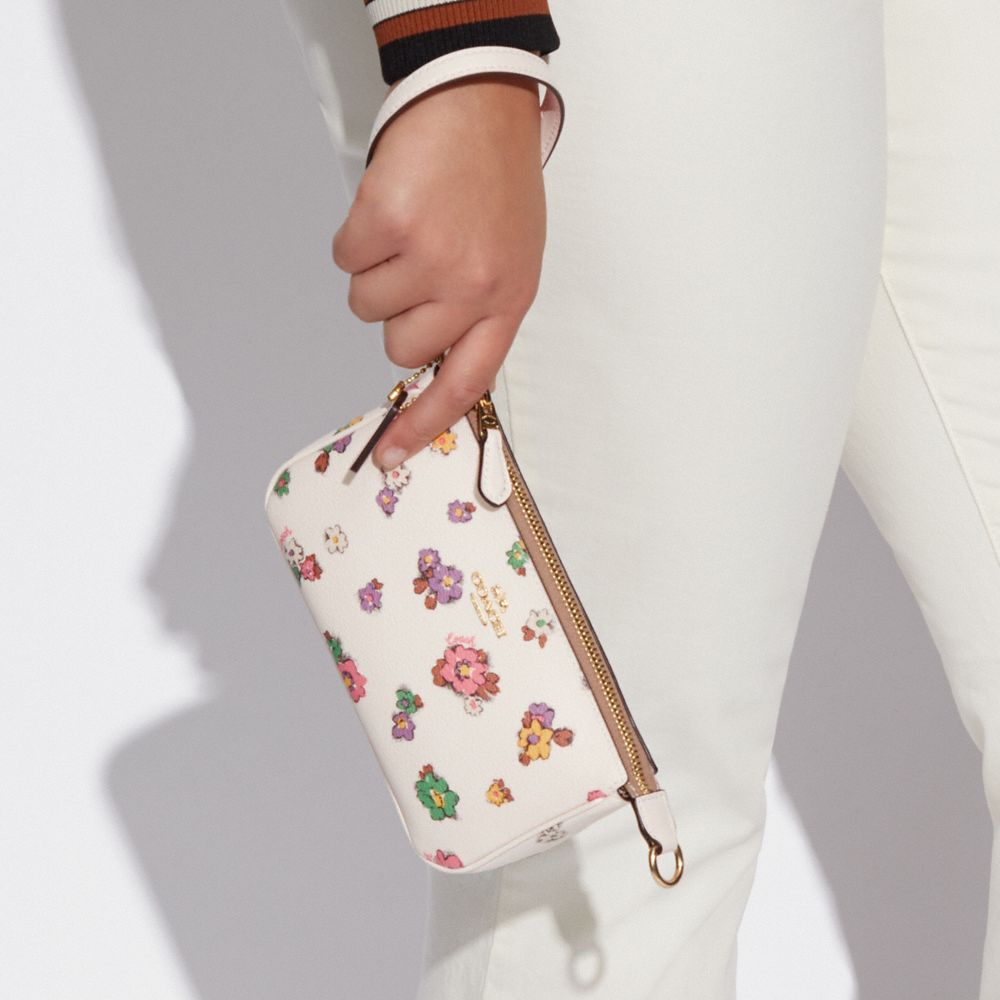 | Printed coated canvas and smooth leather | Two credit card slots | Inside multifunction pocket | Zip-top closure, fabric lining | Handle with 6 1/4" drop | 7 1/2" (L) x 4 1/2" (H) x 2" (W)|Style No. CA738|