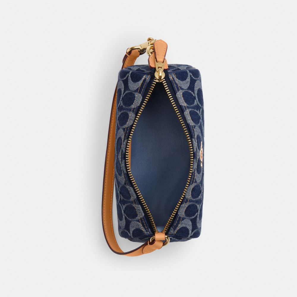 | Signature denim and vachetta leather | Zip-top closure, fabric lining | Handle with 6 3/4" drop | 7 3/4" (L) x 3 1/4" (H) x 3 1/4" (W) | Exclusive of trim, this denim style is crafted of cotton sourced from farms that use regenerative agricultural practices—those that help to maintain and rejuvenate land, increase biological diversity and soil health and could lead to increased carbon absorption|Style No. CZ459|