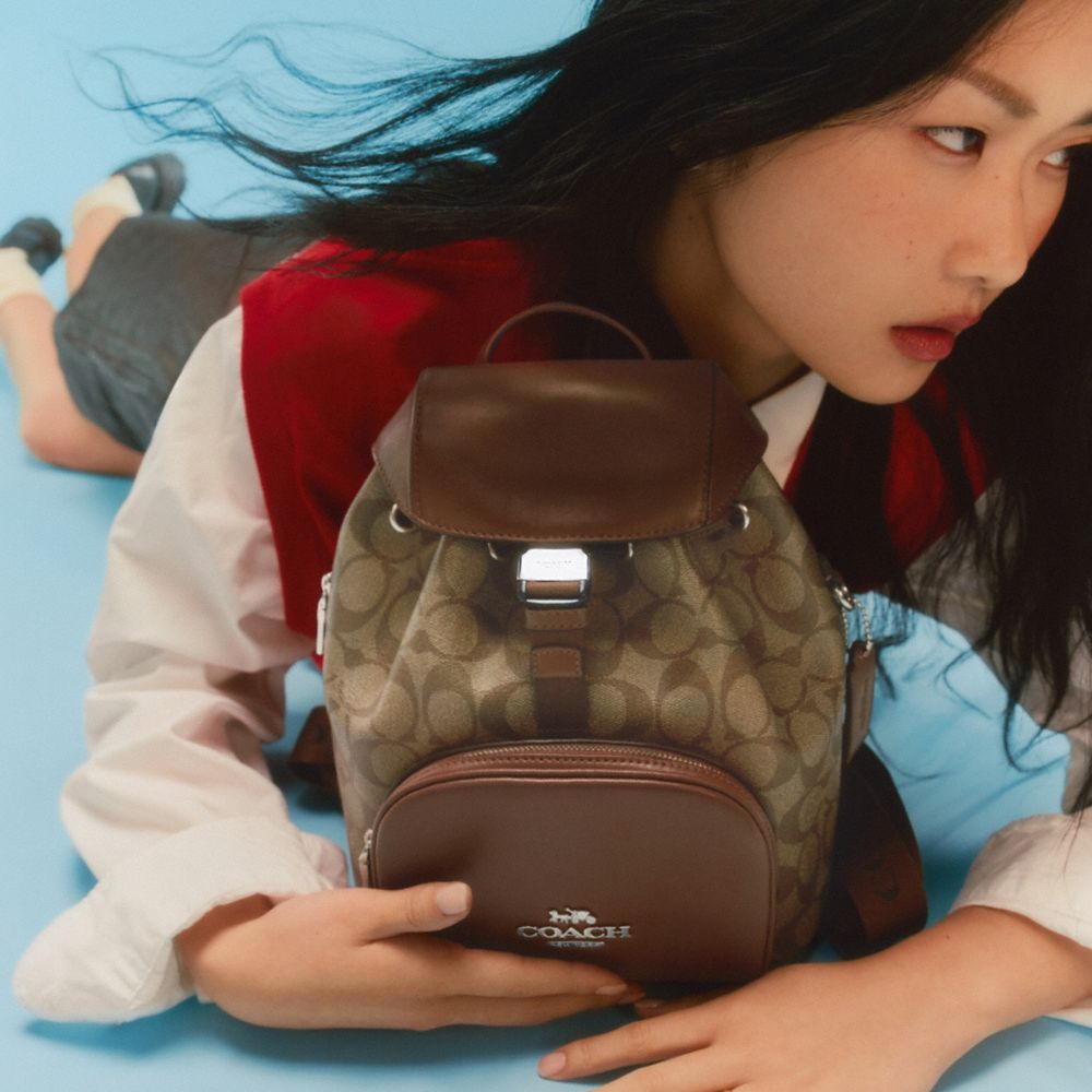 | Signature coated canvas and refined calf leather | Inside zip and multifunction pockets | Drawstring and speedclip closures, fabric lining | Handle with 3" drop | Outside zip pocket | Outside zip access to interior | Adjustable shoulder straps | 8 3/4" (L) x 9 1/2" (H) x 5 1/4" (W)|Style No. CR130|