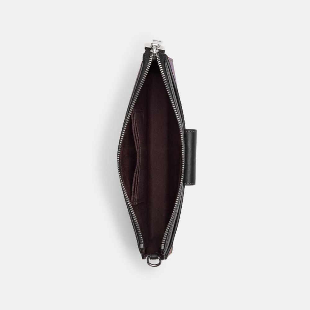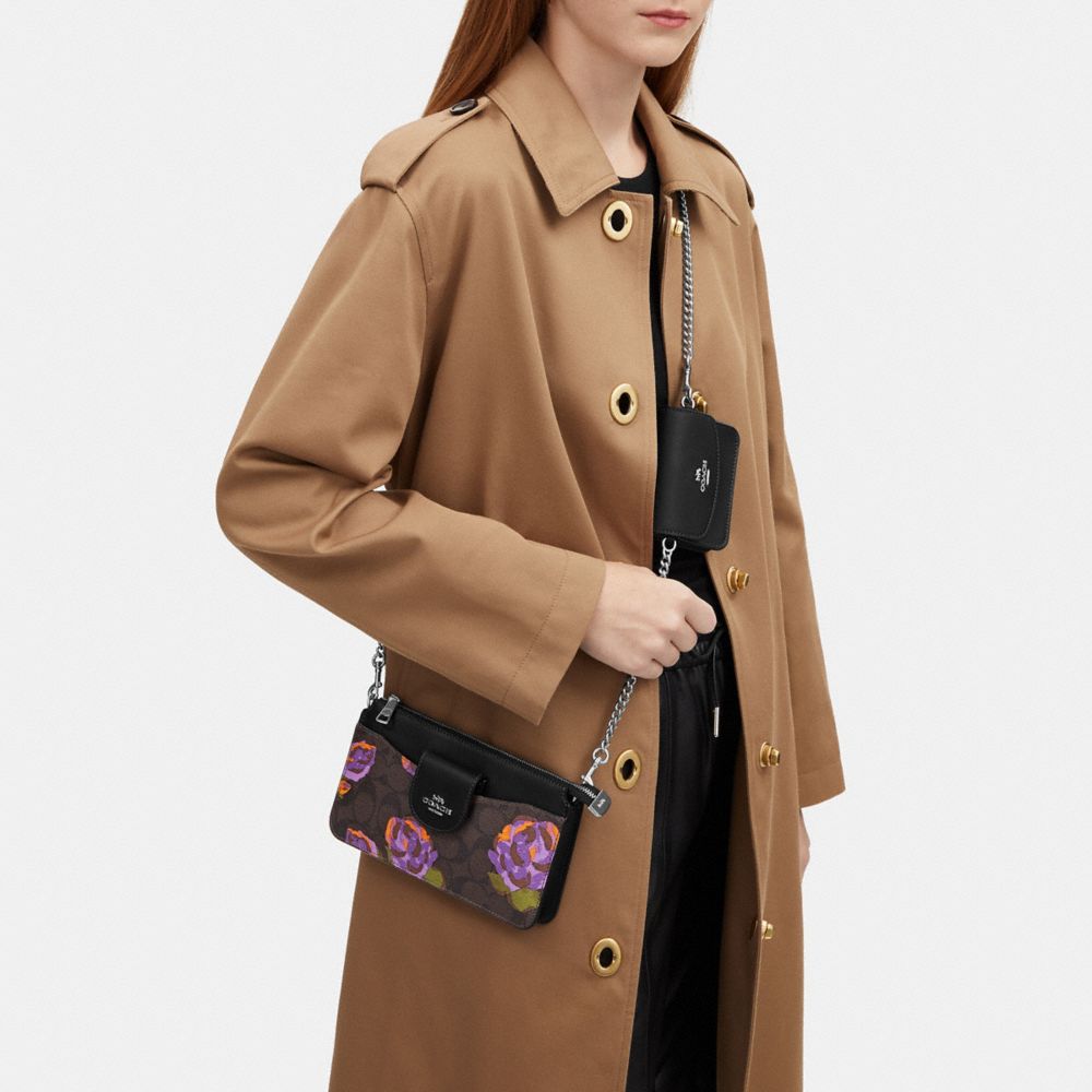 | Crossbody pouch and detachable card case | Crossbody pouch: | Signature coated canvas and smooth leather | Two credit card slots | Zip-top closure, fabric lining | Outside snap pocket | Chain strap with 22" drop for shoulder or crossbody wear (17" drop with card case detached) | 8 1/4" (L) x 4 3/4" (H) x 1 1/4" (W) | Detachable card case: | Smooth leather | Inside multifunction pocket | Snap closure, fabric lining | Outside open pocket | Chain strap with 3" drop | 4" (L) x 3" (H) x 1" (W)|Style No. CL665|
