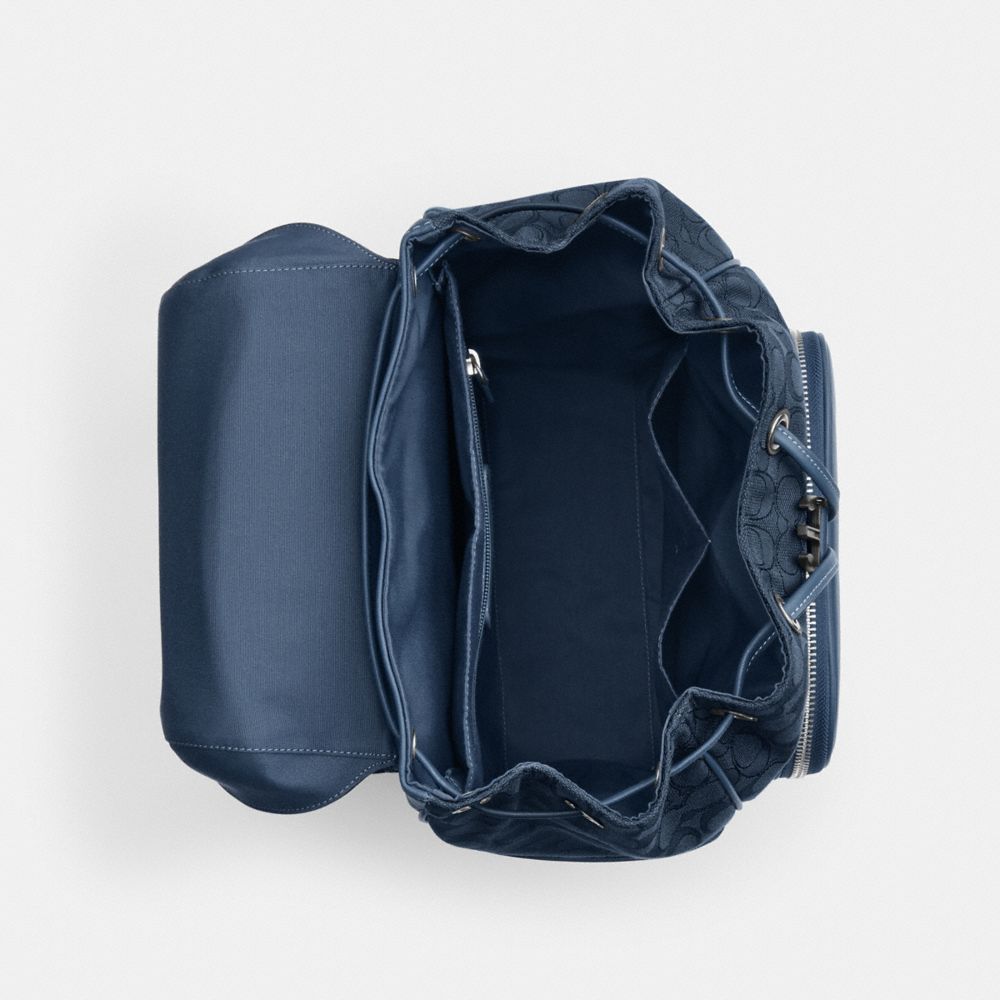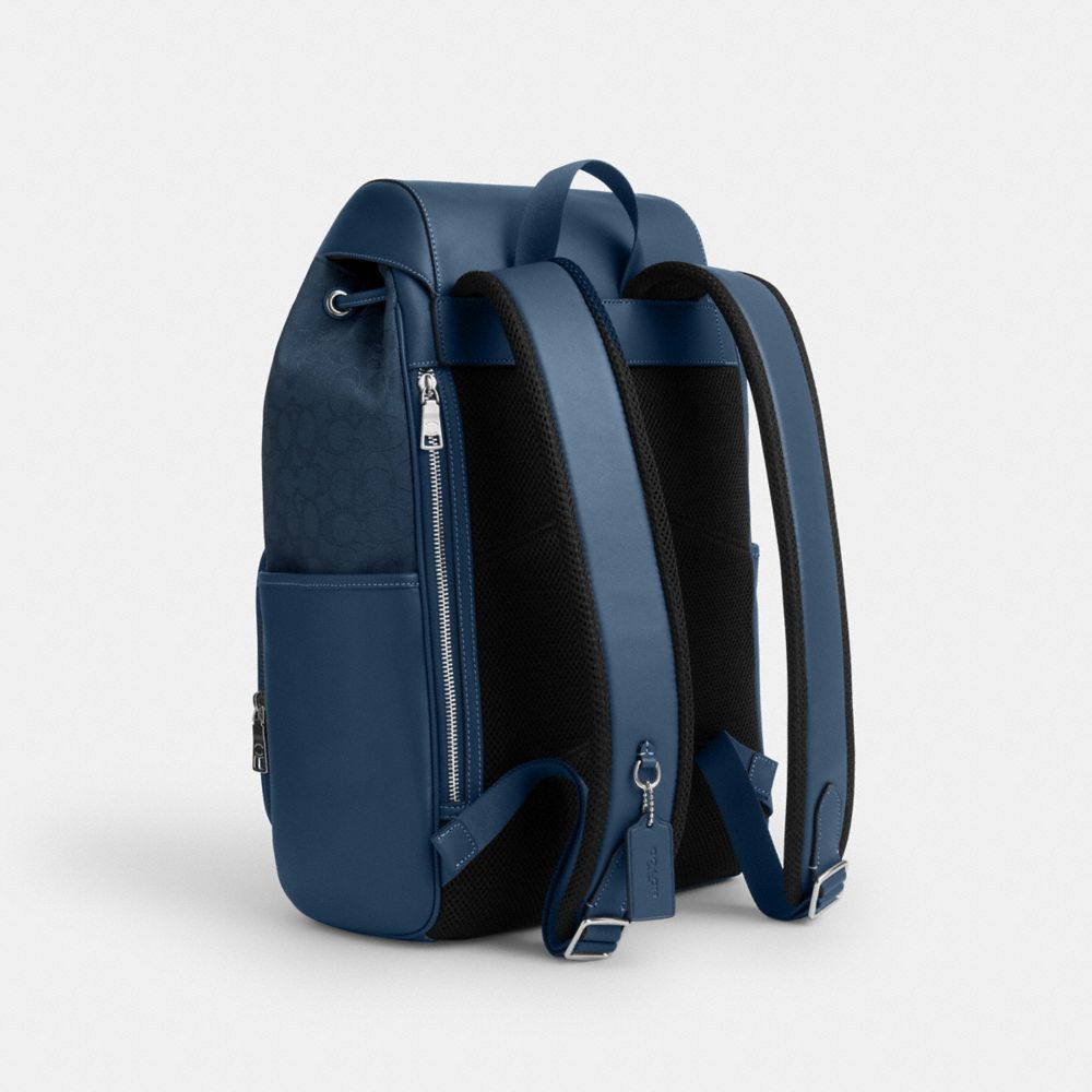 | Signature jacquard and smooth calf leather | Inside zip and multifunction pockets | Inside laptop sleeve | Drawstring and speedclip closures, fabric lining | Handle with 3 1/4" drop | Outside zip and open pockets | Outside access to interior | Adjustable shoulder straps | 10 1/4" (L) x 16 1/4" (H) x 6 1/4" (W) | Exclusive of trim, this Coach piece is crafted of our Signature jacquard made from a blend of regenerative cotton and recycled polyester|Style No. CW172|