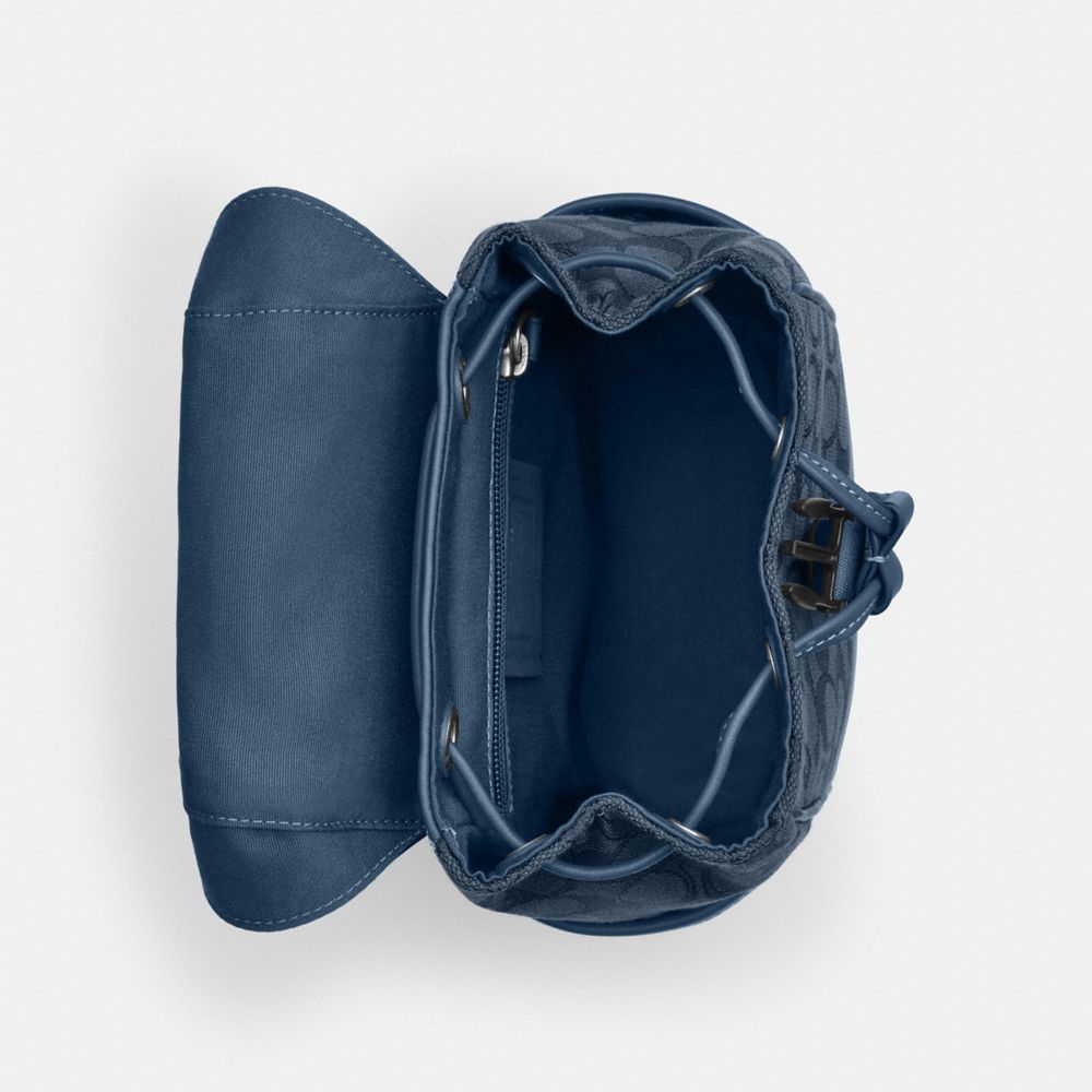 | Signature jacquard and smooth calf leather | Inside zip pocket | Drawstring and speedclip closures, fabric lining | Outside open pockets | Adjustable shoulder strap with 48" length for crossbody wear (clip left or right) | 7" (L) x 10 3/4" (H) x 3 3/4" (W) | Exclusive of trim, this Coach piece is crafted of our Signature jacquard made from a blend of regenerative cotton and recycled polyester|Style No. CW173|