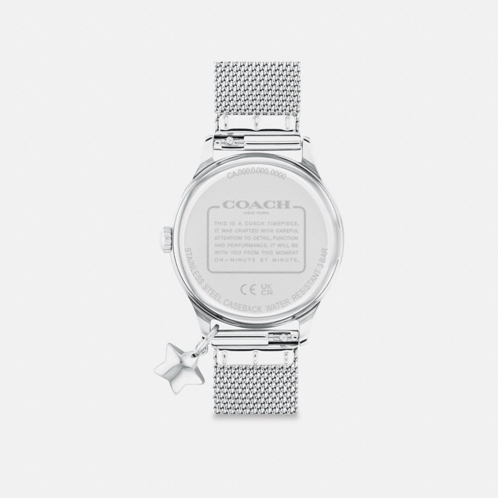 Stainless steel case and mesh bracelet | Includes interchangeable leather strap with buckle closure| Approx. case diameter: 32mm| Mineral crystal| Quartz movement | Foldover clasp closure| Water-resistant to 99 feet| Packaged in a COACH gift box|Style No. CAY94