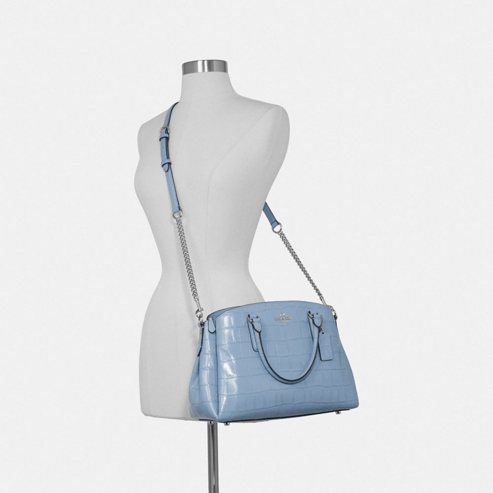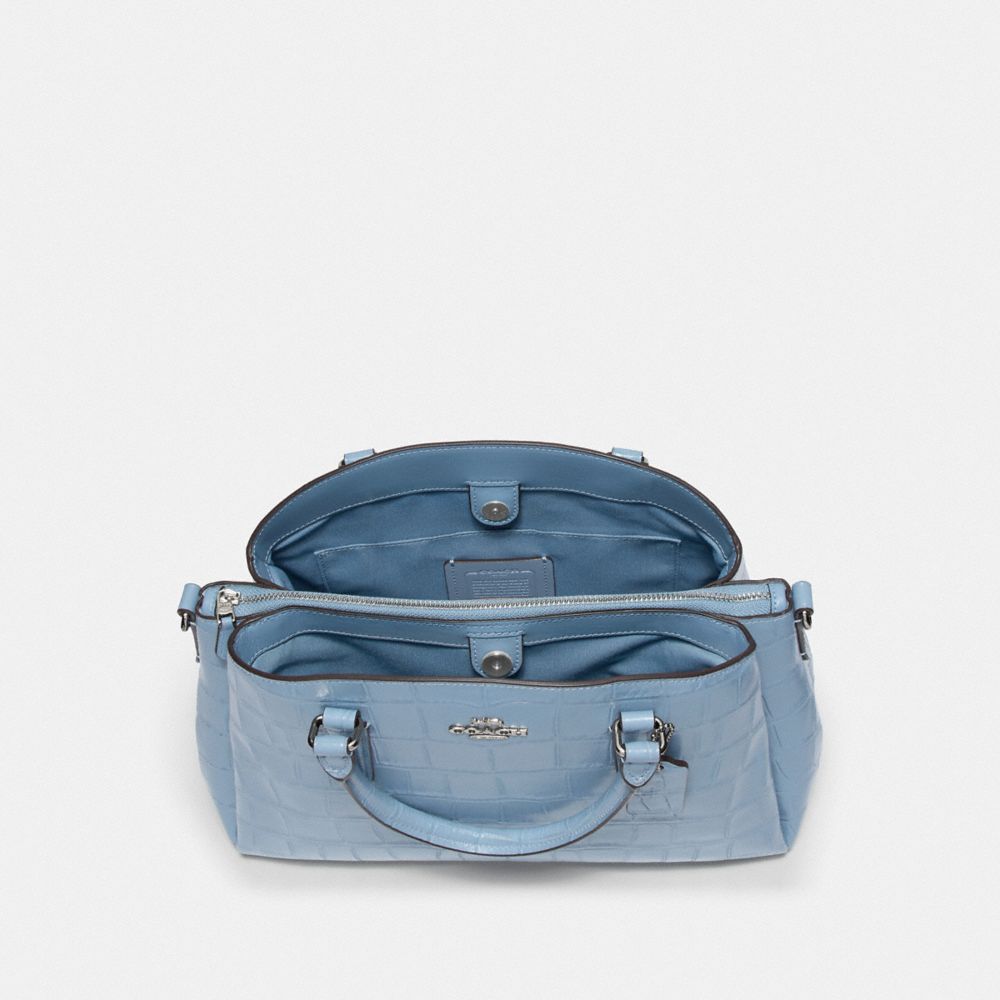 Crocodile embossed leather with smooth leather details| Inside multifunction pocket| Center zip compartment| Snap closure, fabric lining| Handles with 4" drop| Detachable strap with 20" drop for shoulder or crossbody wear| 11 1/2" (L) x 8 3/4" (H) x 5" (W)