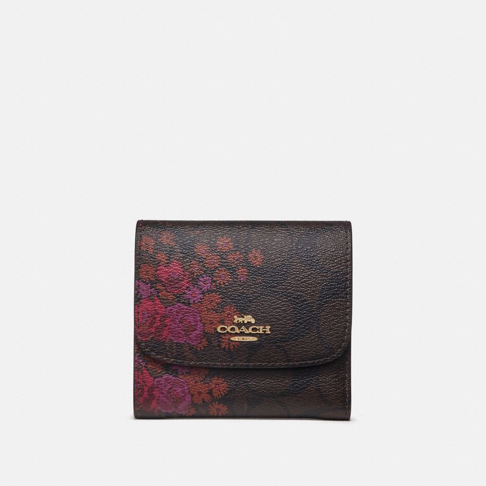 COACH FACTORY OUTLET PRICE CHART - F39157 - SMALL WALLET IN SIGNATURE CANVAS WITH FLORAL BUNDLE PRINT - BROWN/METALLIC CURRANT/LIGHT GOLD