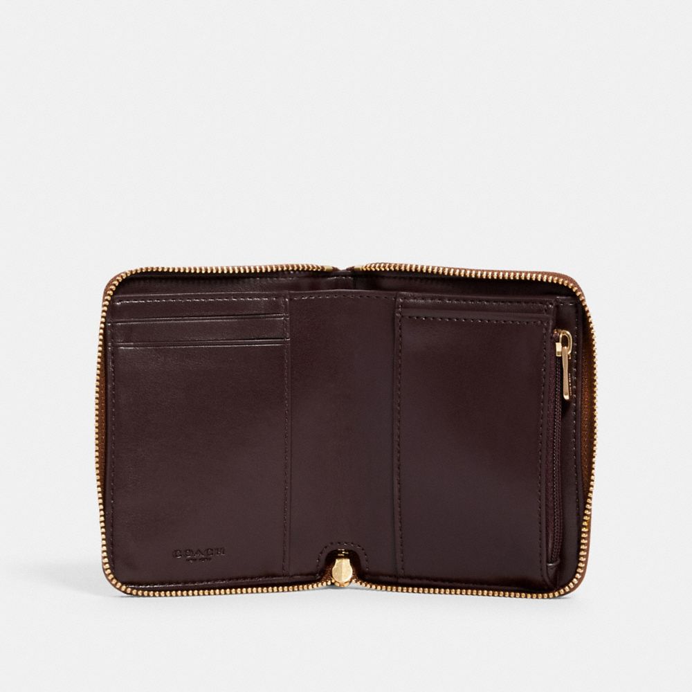 Signature coated canvas| Two credit card slots| Bill compartment| Inside zip coin pocket| Zip-around closure| Outside open pocket| 4 1/2" (L) x 3 3/4" (H) x 3/4" (W)