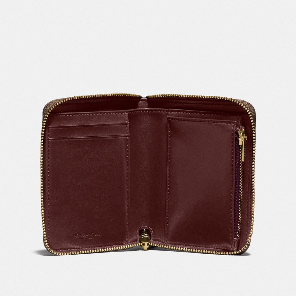 Signature coated canvas| Two credit card slots| Bill compartment| Inside zip coin pocket| Zip-around closure| 4 1/2" (L) x 3 3/4" (H) x 3/4" (W)
