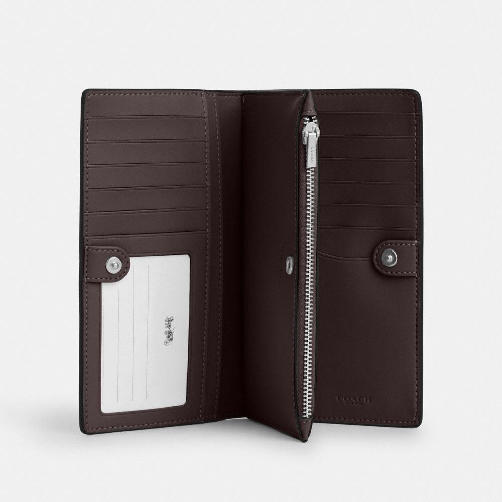 | Refined pebble leather | Twelve credit card slots | ID window | Inside open pockets | Zip coin pocket | Snap closure | 7" (L) x 3 3/4" (H)|Style No. C8329|