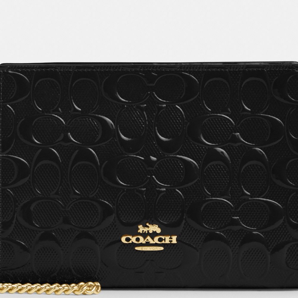 | Signature patent leather | Two credit card slots | Zip-top closure, fabric lining | Chain strap with 22 1/2" drop for shoulder or crossbody wear | 7 3/4" (L) x 5 1/2" (H) x 1 1/4" (W)|Style No. CV407|