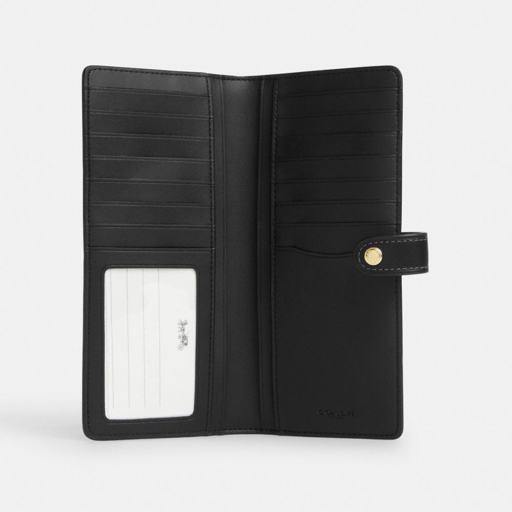 | Printed coated canvas and smooth leather | 15 credit card slots | ID window | Full-length bill compartments | Snap closure | 7 1/2" (L) x 3 1/2" (H) x 1/2 (W)|Style No. CN015|