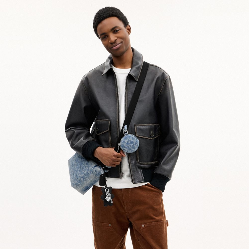 Signature denim, smooth leather and denim| Inside zip pocket| Zip-top closure, recycled polyester lining| Outside zip pocket| Adjustable strap with 28" drop for shoulder or crossbody wear| 10" (L) x 7 1/2" (H) x 3 1/2" (W)| Removable zip pouch:| 3 1/2" (L) x 3 1/2" (H) x 1" (W)| Denim specially treated for a love-worn look| Exclusive of trim, this denim style is crafted of cotton sourced from farms that use regenerative agricultural practices—those that help to maintain and rejuvenate land, increase biological diversity and soil health and could lead to increased carbon absorption|Style No. CDY53
