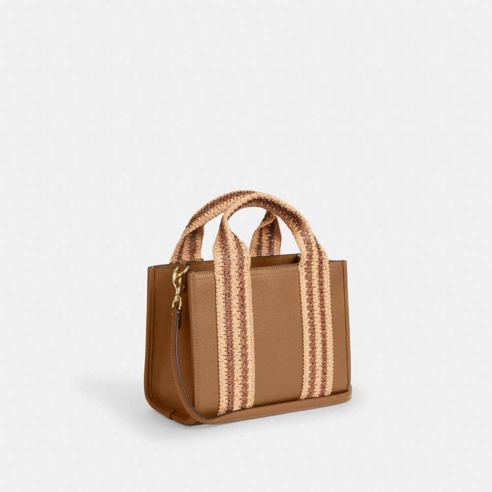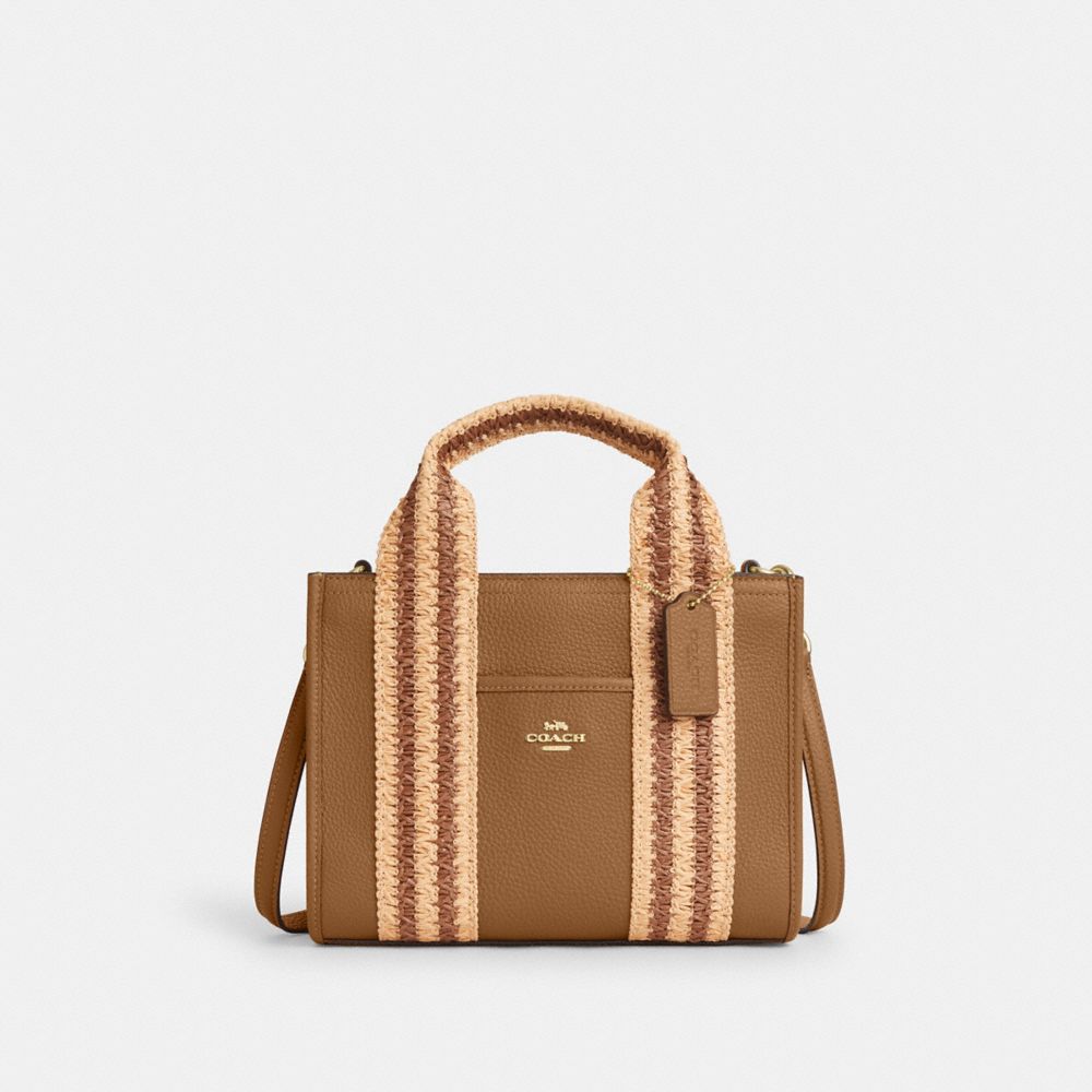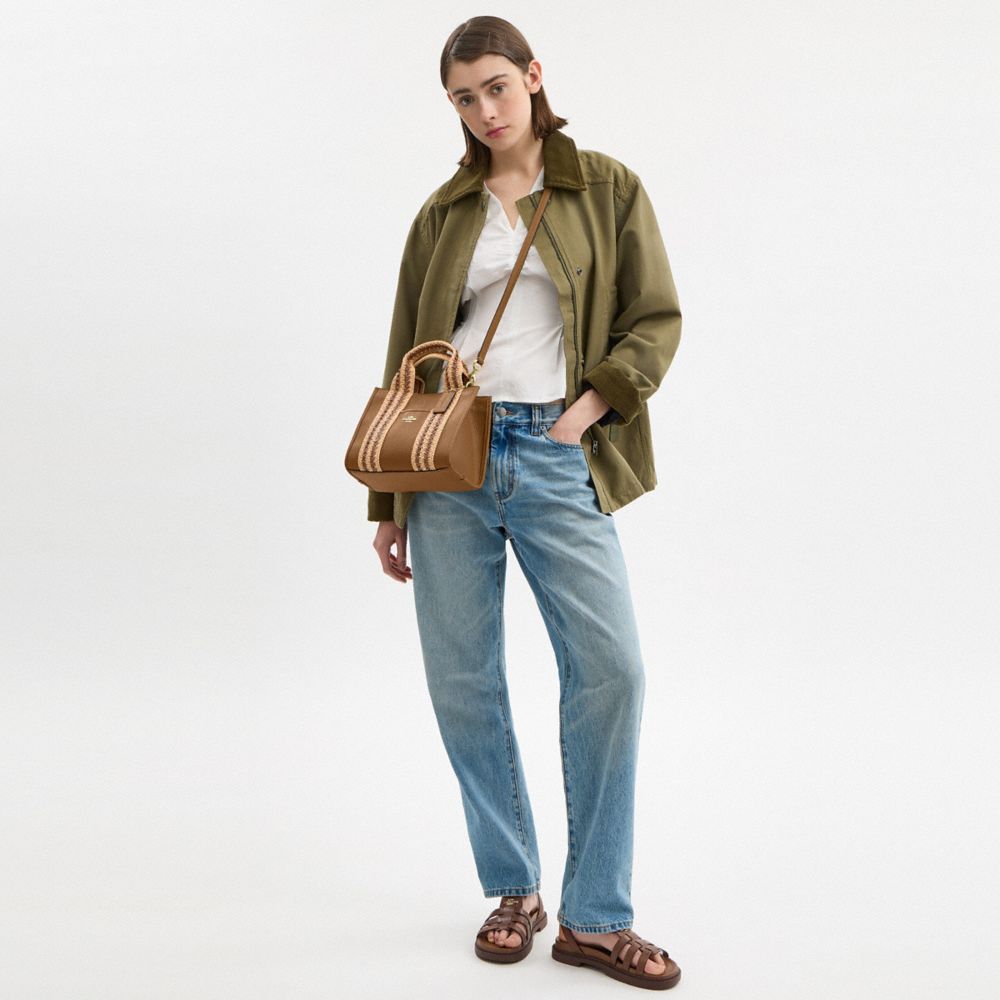 | Refined pebble leather and straw webbing | Inside zip and multifunction pockets | Handles with 3 3/4" drop | Outside open pocket | Detachable strap with 21 3/4" drop for shoulder or crossbody wear | 9 1/2" (L) x 7" (H) x 4 1/2" (W)|Style No. CBG91|