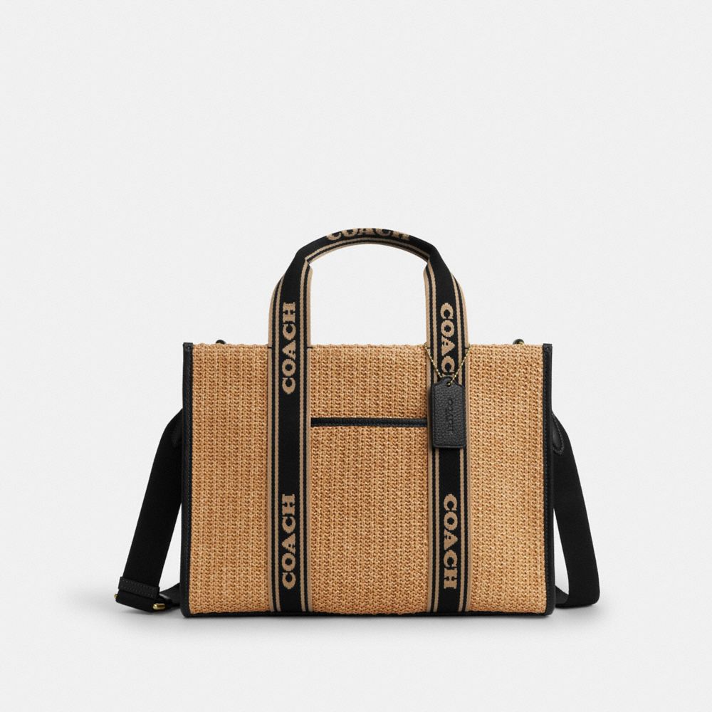 | Straw and refined pebble leather | Inside zip and multifunction pockets | Handles with 5" drop | Outside open pocket | Detachable strap with 22 1/2" drop for shoulder or crossbody wear | 13 1/2" (L) x 10" (H) x 5" (W)|Style No. CAL88|