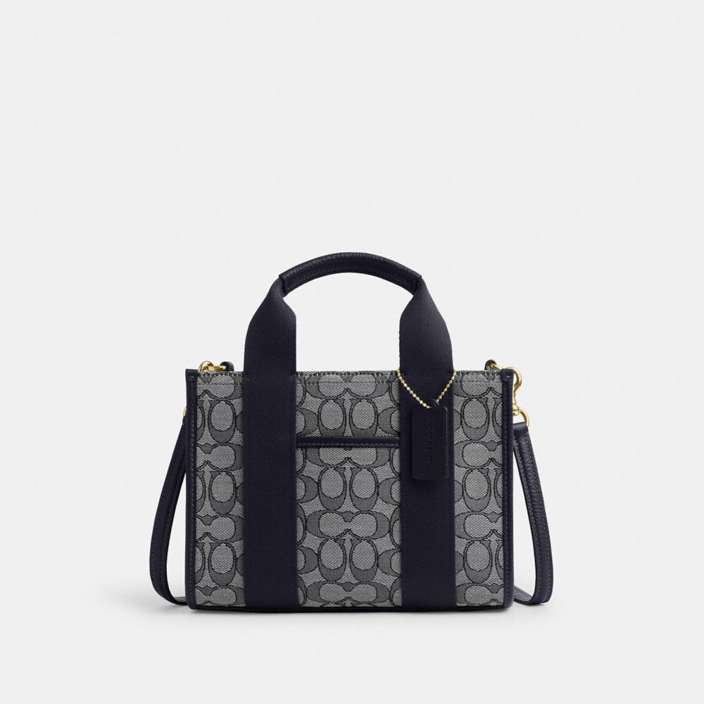 | Signature jacquard and refined pebble leather | Inside zip and multifunction pockets | Handles with 3 3/4" drop | Outside open pocket | Detachable strap with 21 3/4" drop for shoulder or crossbody wear | 9 1/2" (L) x 7" (H) x 4 1/2" (W) | Exclusive of trim, this Coach piece is crafted of our Signature jacquard made from a blend of organic cotton and recycled polyester|Style No. CAR78|