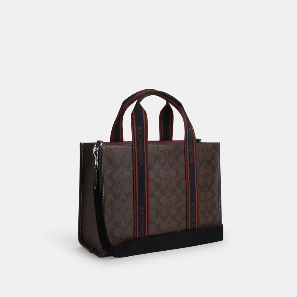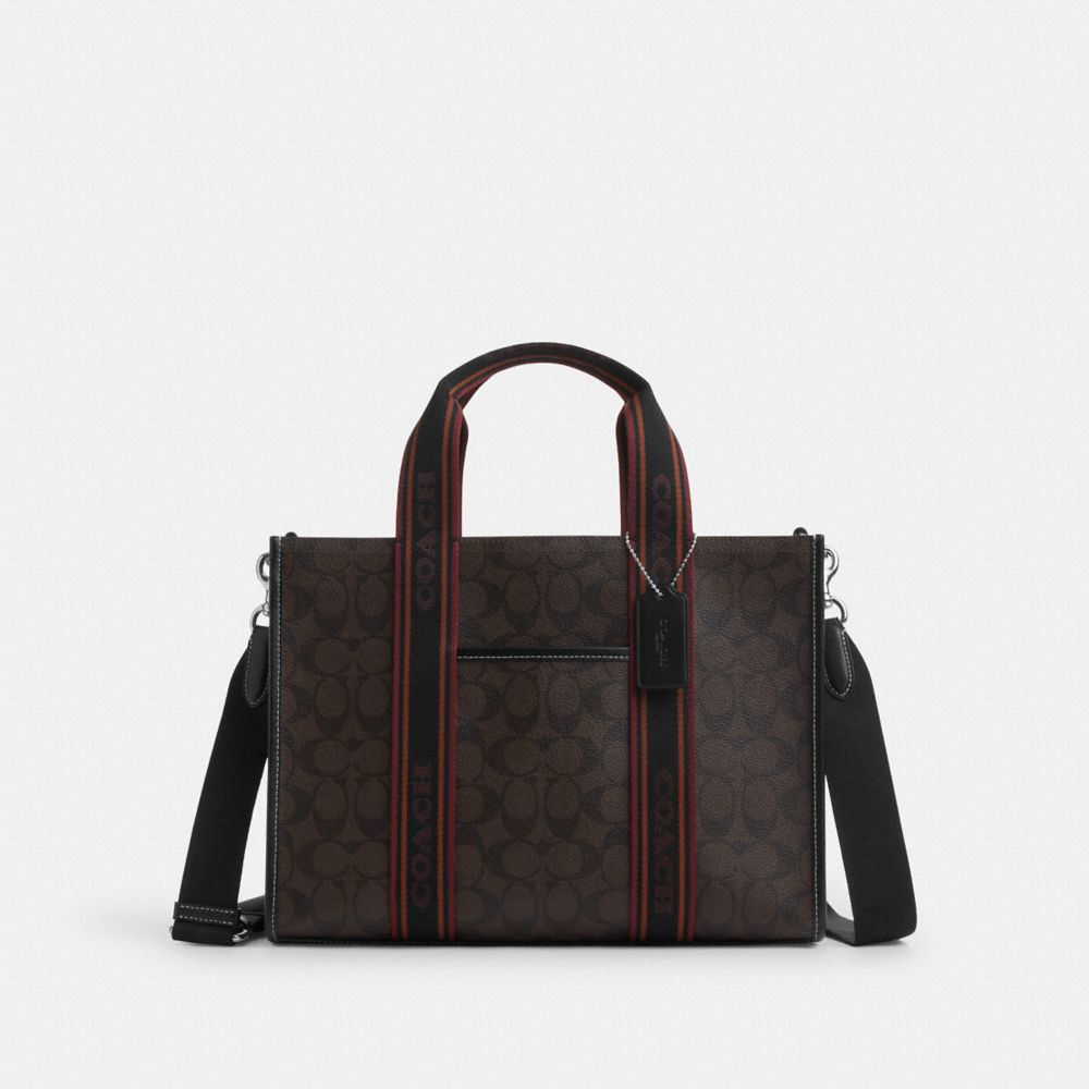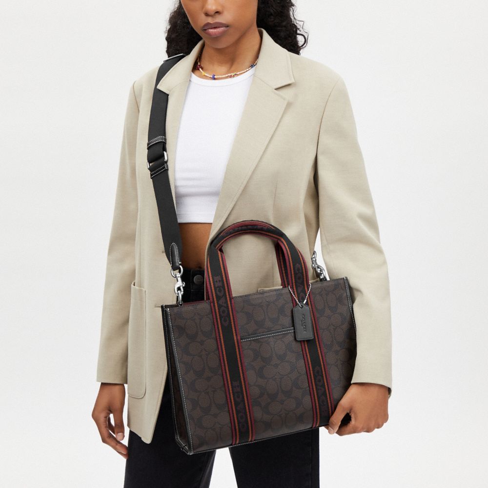 | Signature coated canvas and smooth leather | Inside zip and multifunction pockets | Handles with 5" drop | Outside open pocket | Detachable strap with 22 1/2" drop for shoulder or crossbody wear | 13 1/2" (L) x 10" (H) x 5" (W)|Style No. CU994|