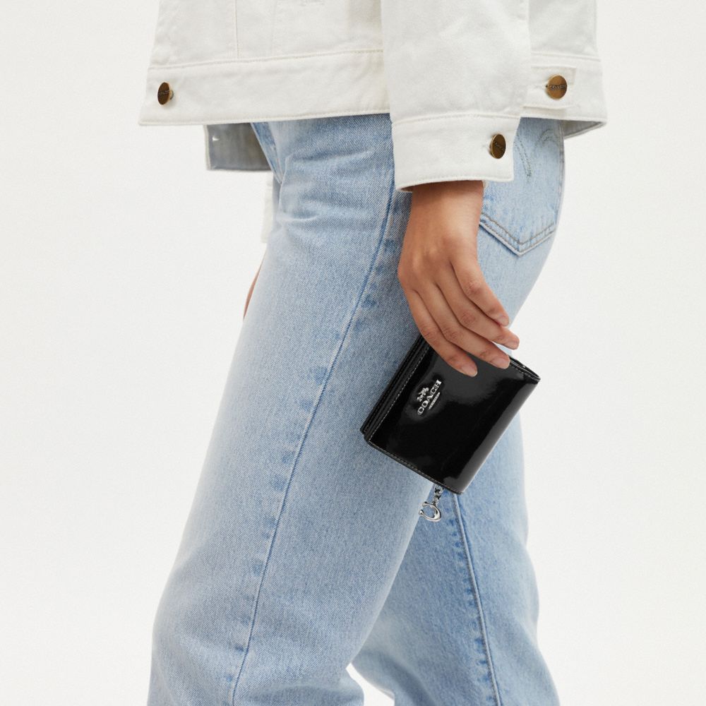 | Patent leather | Three credit card slots | ID window | Full-length bill compartment | Snap closure | Outside zip coin pocket | 4 1/4" (L) x 3 1/2" (H) x 1" (W)|Style No. CN383|