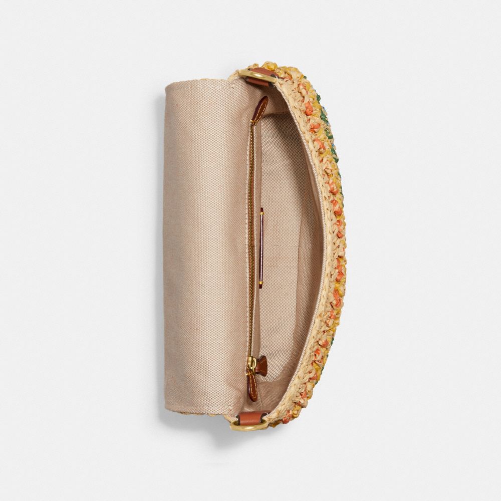 | Straw and smooth leather | Inside zip pocket | Snap closure, fabric lining | Detachable handle with 9" drop | Outside zip pocket | Detachable strap with 21 1/2" drop for shoulder or crossbody wear | 10 1/2" (L) x 6 1/2" (H) x 3 1/2" (W)|Style No. CJ640|