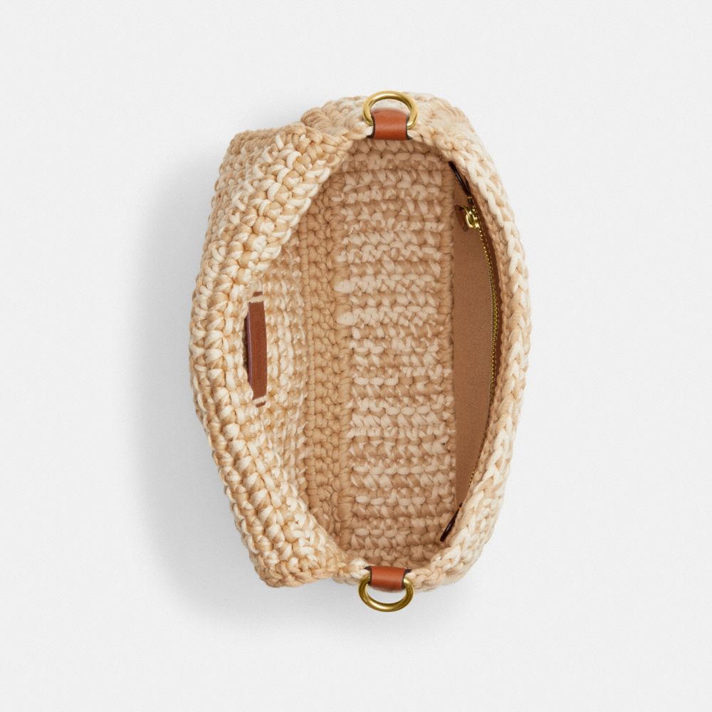 | Crochet yarn and glovetanned leather | Inside zip pocket | Snap closure | Detachable handle with 9" drop | Detachable strap with 21 1/2" drop for shoulder or crossbody wear | 10 1/2" (L) x 6 1/2" (H) x 3 1/2" (W)|Style No. CJ631|