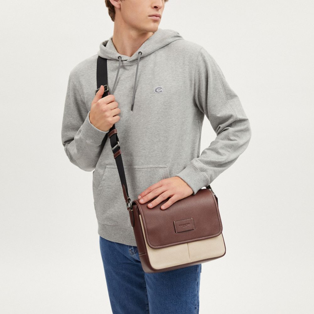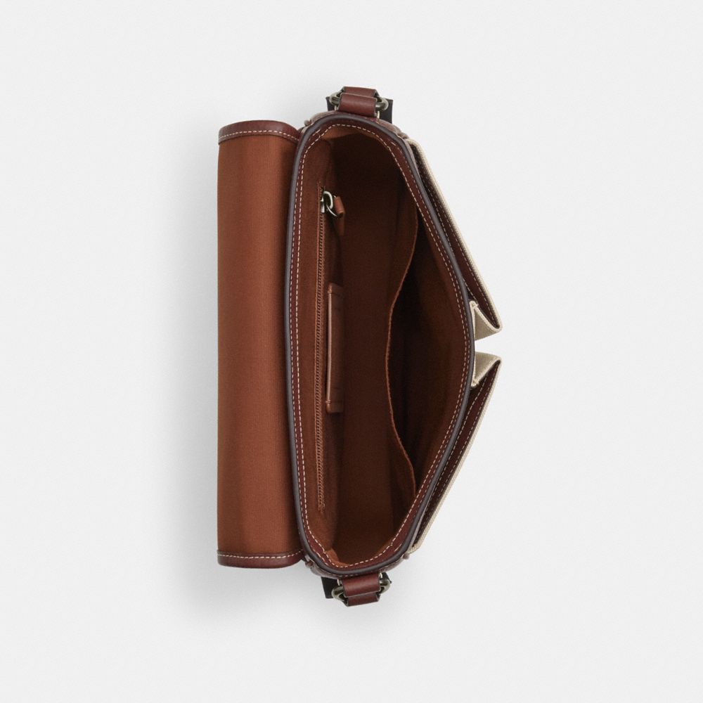 | Canvas and refined pebble leather | Inside zip and multifunction pockets | Magnetic snap closure, fabric lining | Outside open pocket | Adjustable strap with 25" drop for shoulder or crossbody wear | 10" (L) x 8 1/4" (H) x 2 3/4" (W) | Exclusive of trim, this piece is crafted of cotton sourced from farms that use regenerative agricultural practices—those that help to maintain and rejuvenate land, increase biological diversity and soil health, and could lead to increased carbon absorption|Style No. CR333|