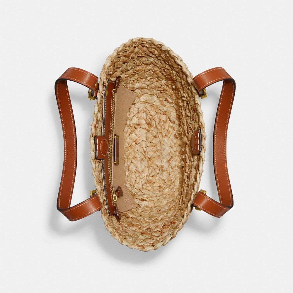 | Straw and refined calf leather | Inside zip pocket | Magnetic snap closure | Adjustable handles with 7" drop | 6 3/4" (L) x 7" (H) x 5" (W)|Style No. CJ638|