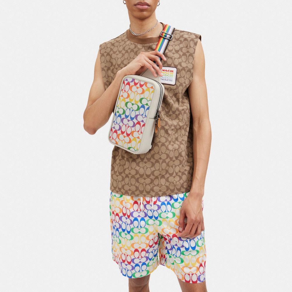 | Signature coated canvas and smooth calf leather | Inside zip and multifunction pockets | Zip closure, fabric lining | Adjustable shoulder strap for crossbody wear (clip left or right) | 6 1/4" (L) x 10 1/2" (H) x 2 1/4" (W) | Celebrating LGBTQIA+ communities everywhere, this month and every month. This year marks a decade of partnership between the Coach Foundation and the Hetrick-Martin Institute, and continuing partnerships with the Point Foundation and CenterLink Community of LGBTQ Centers. All three organizations create supportive environments where LGBTQIA+ young people can thrive. Learn more at coach.com/coachfoundation.|Style No. CJ581|