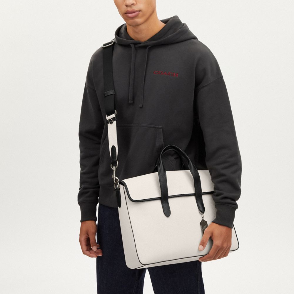 | Refined pebble leather | Inside zip and multifunction pockets | Inside laptop sleeve with secure tab | Magnetic snap closure, fabric lining | Handles with 4 3/4" drop | Outside magnetic snap pocket | Detachable strap with 25" drop for shoulder or crossbody wear | 15 1/4" (L) x 11" (H) x 3 3/4" (W)|Style No. CP058|