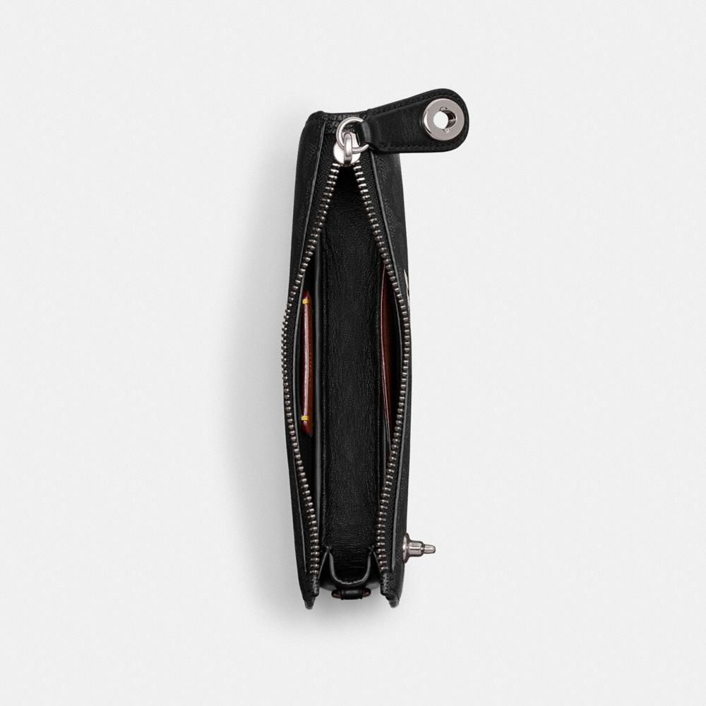| Signature coated canvas and refined calf leather | Three credit card slots | Zip-top closure, leather lining | Detachable strap with 12" drop | 8 1/4" (L) x 4 3/4" (H) x 1 1/4" (W)|Style No. CP956|