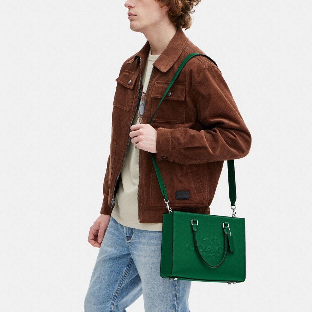 | Crossgrain leather and Signature coated canvas | Inside zip and multifunction pockets | Zip-top closure, fabric lining | Handles with 5" drop | Detachable strap with 21 3/4" drop for shoulder or crossbody wear | Includes interchangeable webbing strap with 25" drop | Four protective feet at base | 8 3/4" (L) x 11" (H) x 3 3/4" (W)|Style No. CJ845|