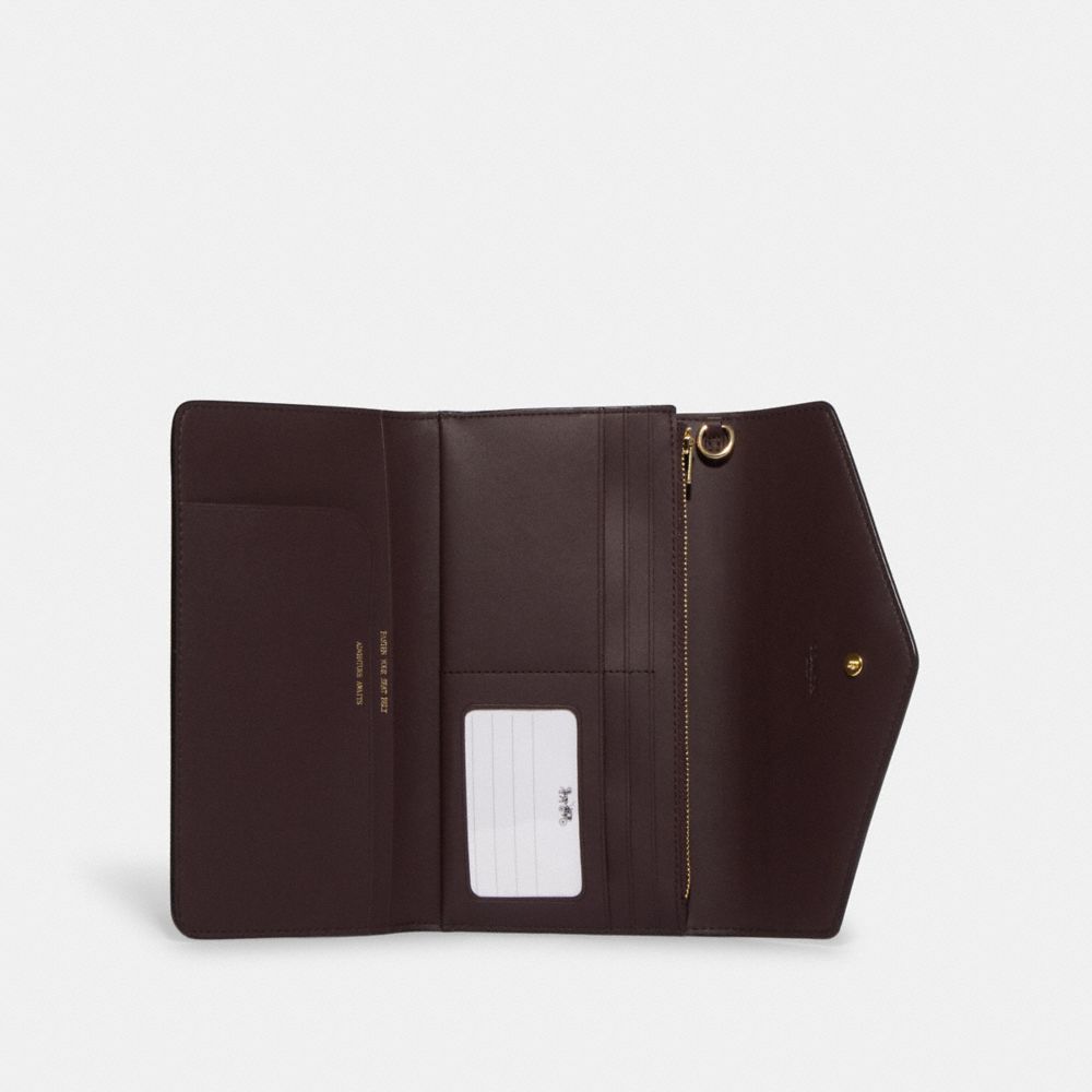 | Signature coated canvas and smooth leather | Five credit card slots | ID window | Inside zip and open pockets | Snap closure | Outside zip coin pocket | Detachable wrist strap | 8 1/4" (L) x 4 1/2" (H)|Style No. CC860|