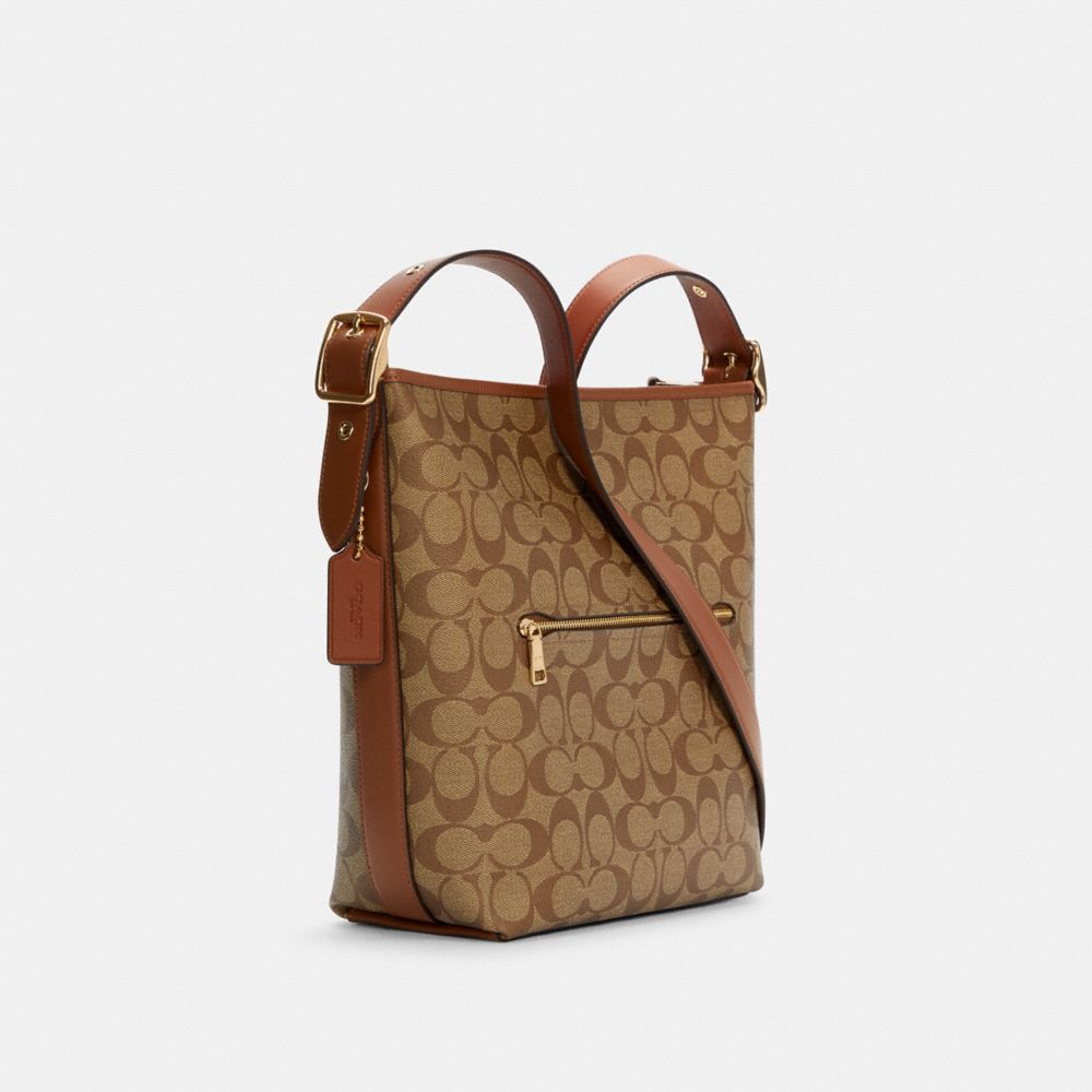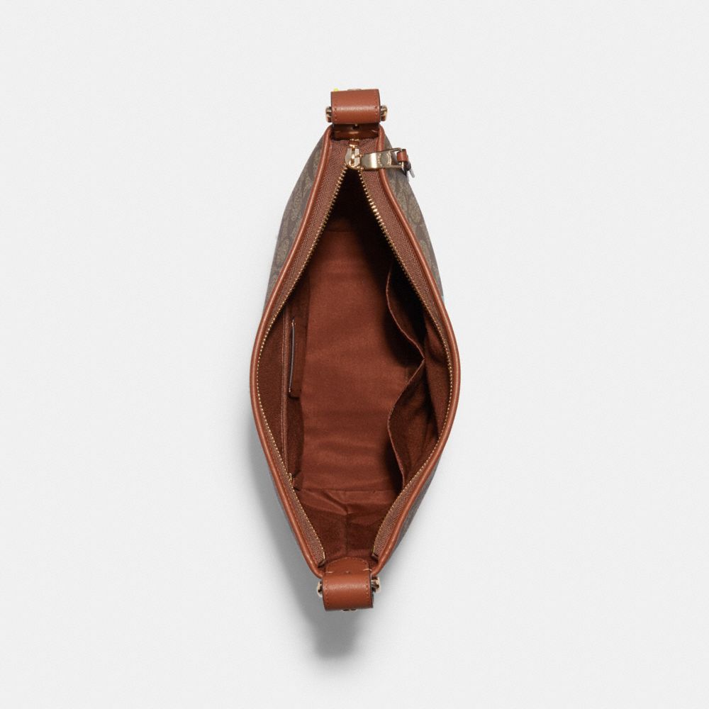 Signature coated canvas and smooth leather| Inside zip, cell phone and multifunction pockets| Zip-top closure, fabric lining| Outside zip pocket| Adjustable strap with 21" drop for shoulder or crossbody wear| 9" (L) x 11 1/4" (H) x 1/2" (W)Style No. C5641
