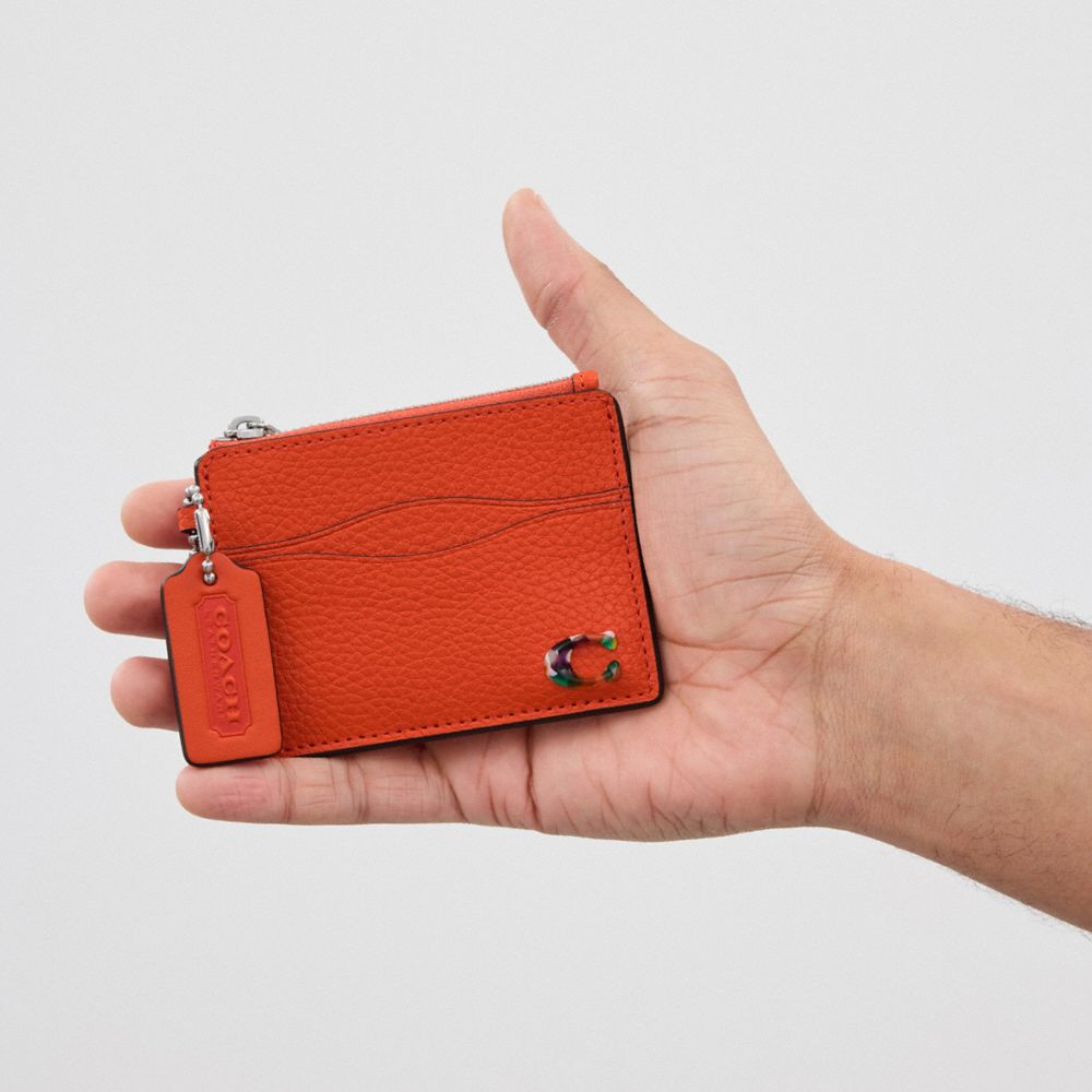 | Shell: pebbled Coachtopia leather (at least 50% recycled leather fibers from scraps) | C Plaque: 70% recycled acrylic plastic | 6 card slots | Center zip pocket | Attached split key ring | 4" (L) x 3” (H)