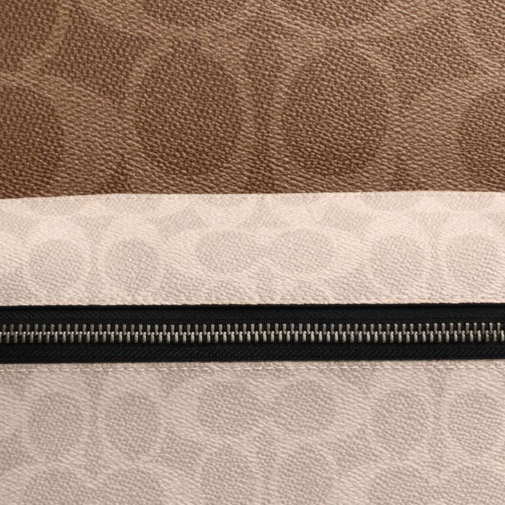 | Signature coated canvas and smooth calf leather | Two separate main compartments with zip closures | Inside zip, cell phone and multifunction pockets | Fabric lining | Top handle with 3 1/4" drop | Outside zip pocket | Adjustable shoulder straps | 12 1/2" (L) x 16 3/4" (H) x 6" (W)|Style No. CAB59|