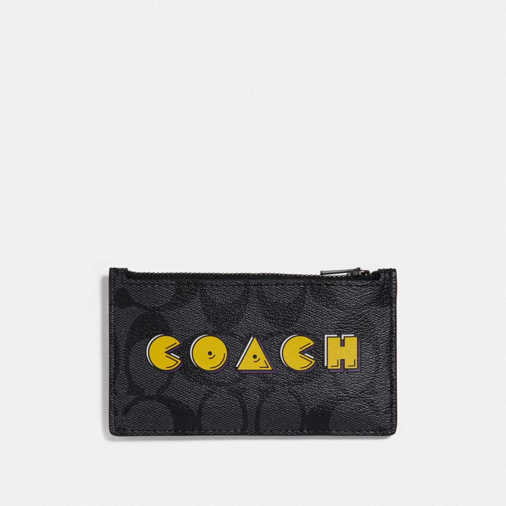 ZIP CARD CASE IN SIGNATURE CANVAS WITH PAC-MAN COACH SCRIPT (COACH F73225)