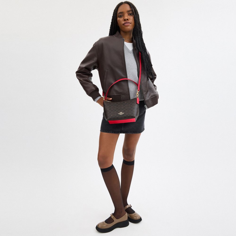 | Signature coated canvas and smooth leather | Inside multifunction pocket | Zip-top closure, fabric lining | Handle with 8 1/4" drop | Detachable strap with 22 1/2" drop for shoulder or crossbody wear | 7 3/4" (L) x 6 3/4" (H) x 4 1/4" (W)|Style No. CX610|